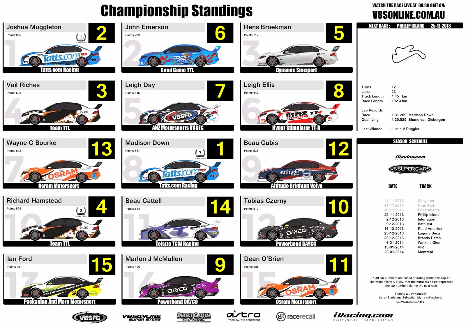 iRacing V8 Supercar Spotter Guide , Championship Standings (After Week 2)